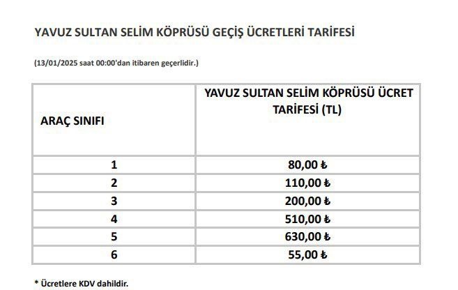 - Yavuz Sultan Selim Köprüsü: 80 TL